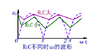 電容充電時間常數(shù)為rDC,因?yàn)槎O管的rD很小,所以充電時間常數(shù)小,充電速度快;RLC為放電時間常數(shù),因?yàn)镽L較大,放電時間常數(shù)遠(yuǎn)大于充電時間常數(shù),因此,濾波效果取決于放電時間常數(shù)。電容C愈大,負(fù)載電阻RL愈大,濾波后輸出電壓愈平滑,并且其平均值愈大,如圖所示。