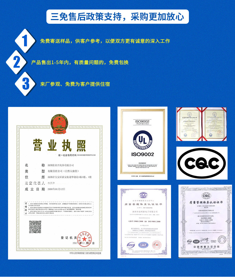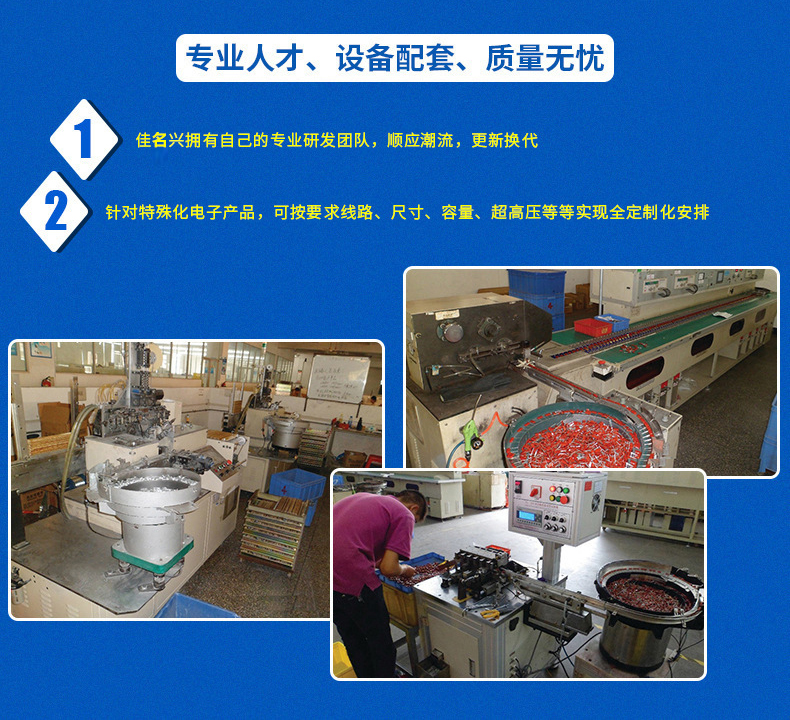 2017年12月28日正式更名為深圳佳名興電容有限公司 佳名興JMX廣東省惠州市電容器工廠占地面積13149平米,廠房面積8227平方米,每年生產(chǎn)的超級(jí)電容(單體、模組、方案定制)薄膜類電容(包括:金屬化薄膜電容、軸向薄膜電容,工業(yè)級(jí)電源用薄膜電容、長壽命薄膜電容、等)軸向鋁電解電容、電力電容器、雙面金屬化薄膜電容等被動(dòng)元器件達(dá)8-13億只 佳名興JMX電容器60%-70%以上產(chǎn)品出口歐美,印度,東南亞等世界各地,30%-40%銷往中國大陸,產(chǎn)品規(guī)格齊全,體積小,可靠性優(yōu)良,穩(wěn)定性好,價(jià)格合理 佳名興JMX電容器被廣泛用于:汽車音響,車載分音器,音響分頻器,專業(yè)音響功放,衛(wèi)星通訊設(shè)備,LED驅(qū)動(dòng)電源,LED節(jié)能燈,開關(guān)電源及電腦周邊產(chǎn)品等各個(gè)電子行業(yè)