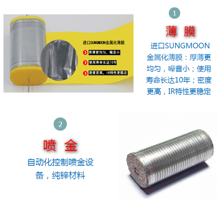 CBB20為無感結(jié)構(gòu),用金屬化聚丙烯膜作電介質(zhì)/電極繞制而成,引線采用鍍錫銅包鋼線,外層用聚酯膠帶包裹,兩端灌注環(huán)氧樹脂。 體積小,重量輕;容量穩(wěn)定性好;自愈性能優(yōu)異;高頻損耗小;廣泛用于高頻、直流、交流和脈沖電路中。