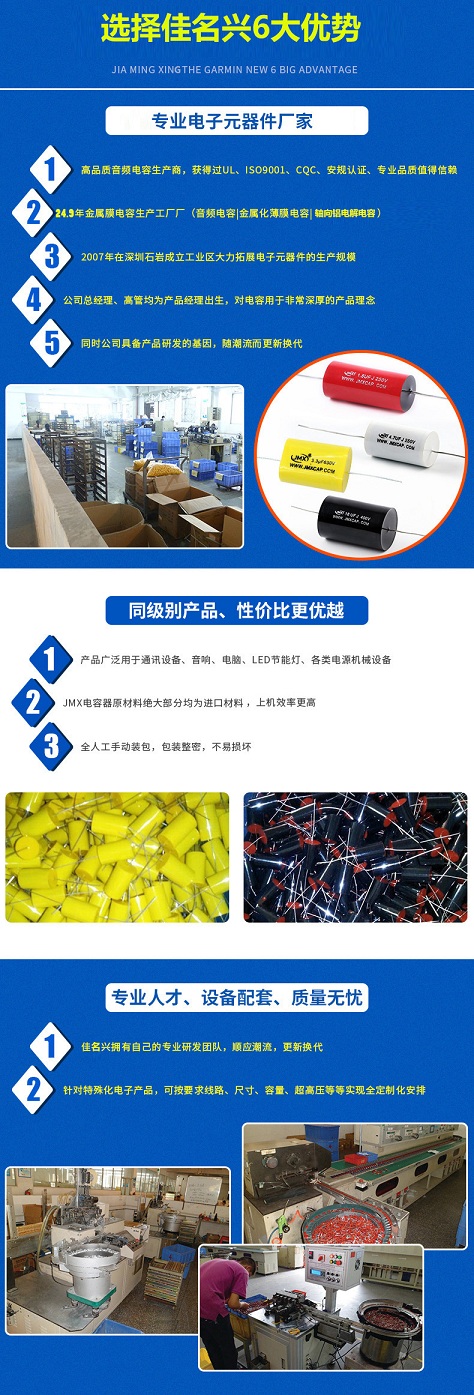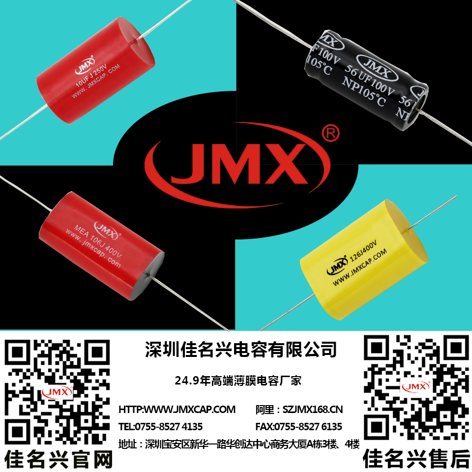 JMX牌電容已為上千家客戶提供優(yōu)質(zhì)高端電容近20年, JMX牌電容已經(jīng)成為中國最優(yōu)質(zhì)誠信的電容供應商之一,熱誠歡迎各界朋友蒞臨佳名興電容器工廠參觀,指導和業(yè)務洽談,看了以上的音頻電容選擇介紹希望能給您帶來幫助