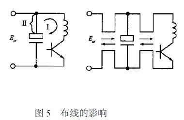流過(guò)開關(guān)大電流的導(dǎo)線應(yīng)盡量短,并且不跟其它線交連。降壓型開關(guān)穩(wěn)壓電源的續(xù)流二極管或者升壓型的開關(guān)三極管的接地端應(yīng)以最短的引線直接與輸出電容的地端相連。圖5表示了布線的影響,尖峰干擾通過(guò)環(huán)路I輻射,故構(gòu)成這一環(huán)路的各段連線的感性耦合必須最小,電容器的引線要短,以減小引線電感。