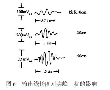 為減小輸出線上的損耗和尖峰干擾,輸出到負(fù)載的連線應(yīng)短。圖6畫出了對(duì)三種不同長(zhǎng)度的輸出線,當(dāng)負(fù)載電流為8A時(shí),在負(fù)載端所測(cè)得的干擾波形。輸出線長(zhǎng),尖峰干擾的幅度大、寬度也寬。相同長(zhǎng)度的輸出線,線徑粗則尖峰干擾幅度大、寬度寬。用雙絞線能有效地衰減電磁感應(yīng)電勢(shì),表1說(shuō)明對(duì)感應(yīng)電勢(shì)衰減的數(shù)值隨扭距變短而增大。