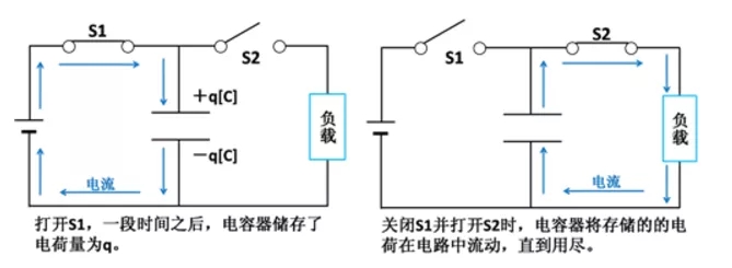 <電容器的工作>電容器儲存的電荷在開關(guān)S1為OFF,S2為ON的時(shí)候,向負(fù)載電流流動(dòng)。