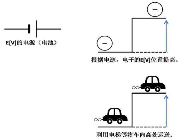 <電源(電池)是負(fù)載著電位差的裝置>電源是在兩端連接負(fù)載著E[V]電位差的裝置。這與汽車?yán)秒娞?,自?dòng)地向高為t[m]的位置移動(dòng)是一個(gè)道理。