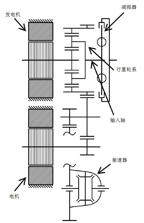 豐田(Toyota)集成發(fā)動(dòng)機(jī)電動(dòng)機(jī)發(fā)電機(jī)的變速器,剖視圖如圖9所示,原理圖如圖10所示。應(yīng)用在第四代普銳斯(Prius)等車型上。