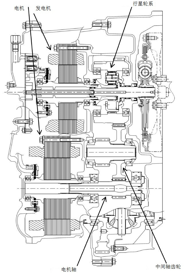 吉?jiǎng)P恩集成發(fā)動(dòng)機(jī)電動(dòng)機(jī)發(fā)電機(jī)的變速器,剖視圖如圖7所示。應(yīng)用在三菱歐藍(lán)德(Mitsubishi Outlander)混合動(dòng)力汽車上。